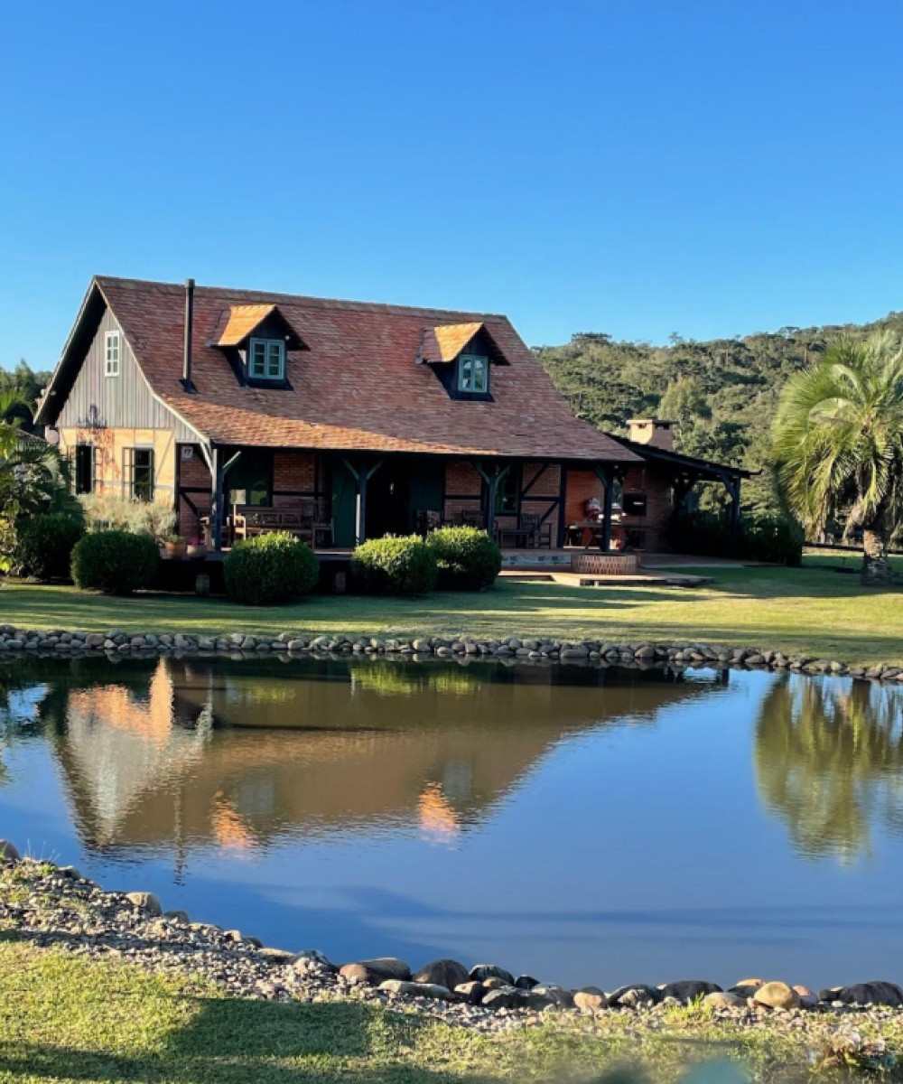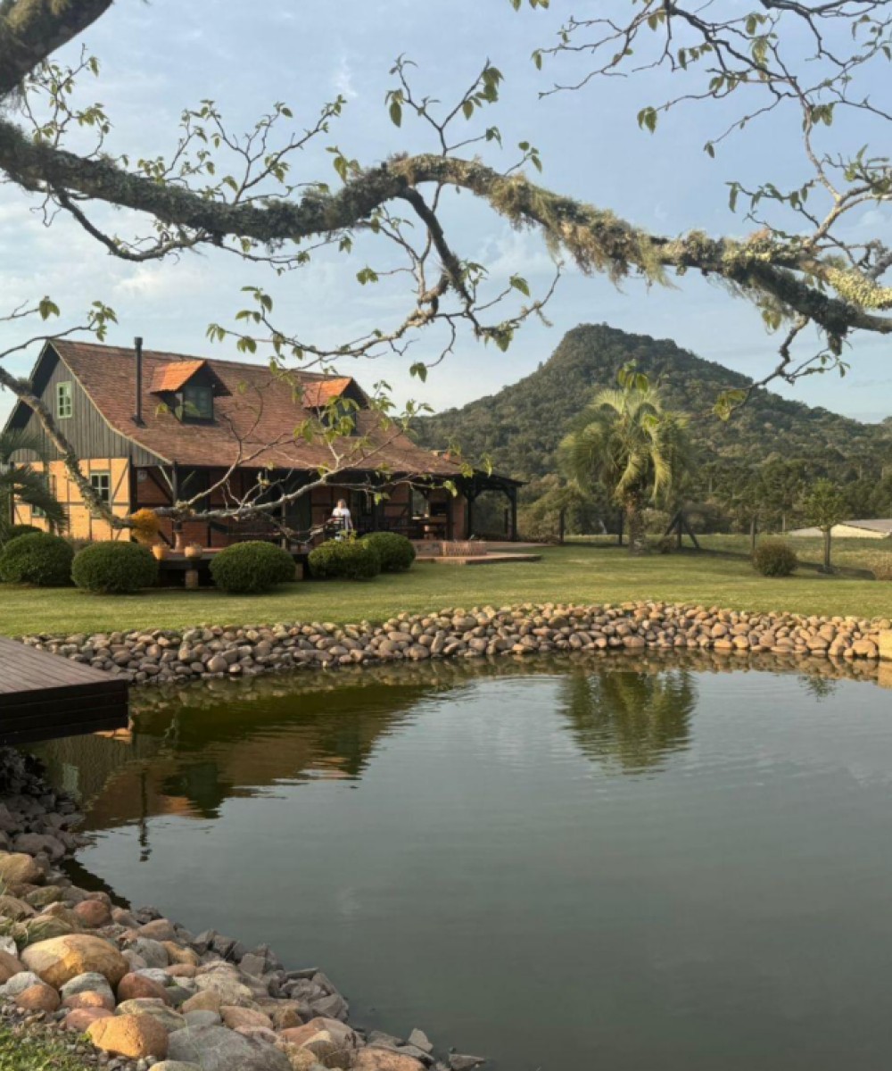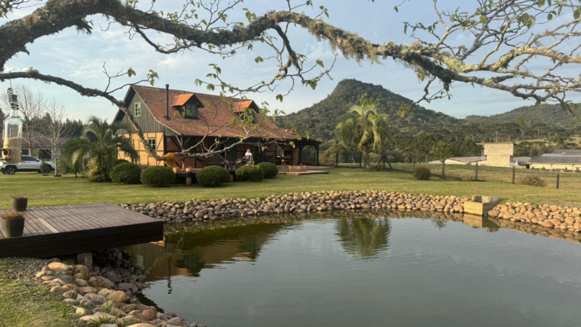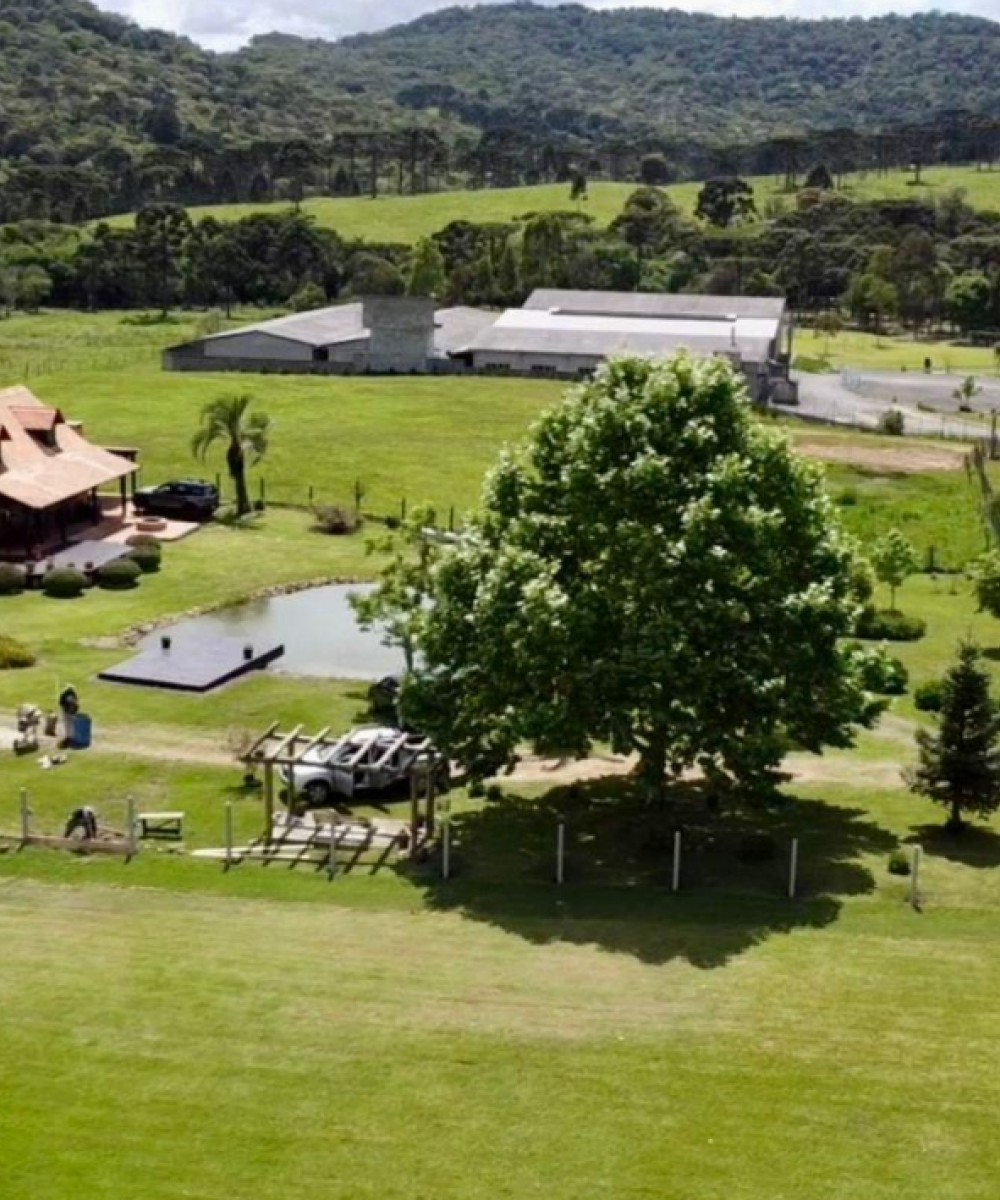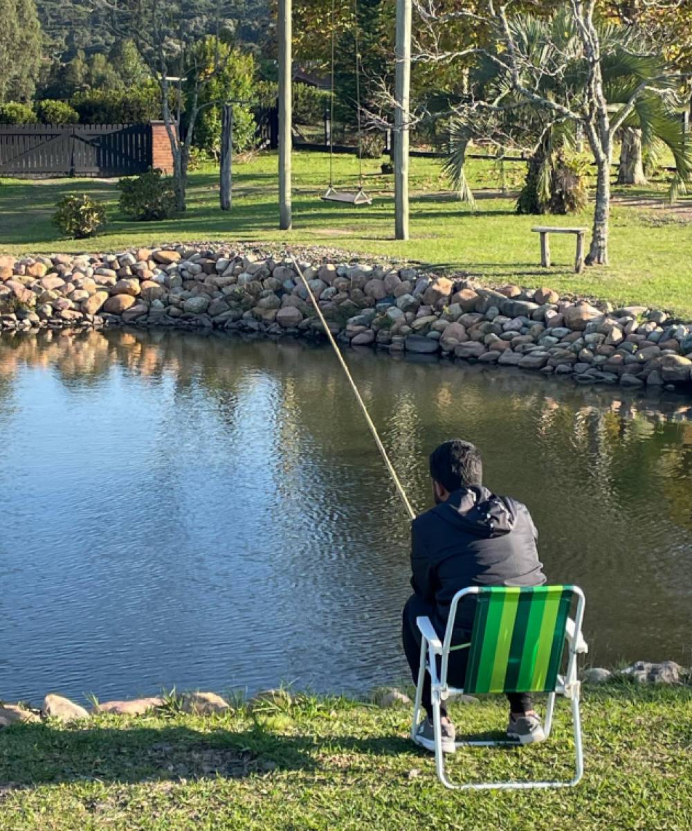 Lago com peixes para quem quiser pescar. Área coberta de garagem, churrasqueira e um banheiro externo.