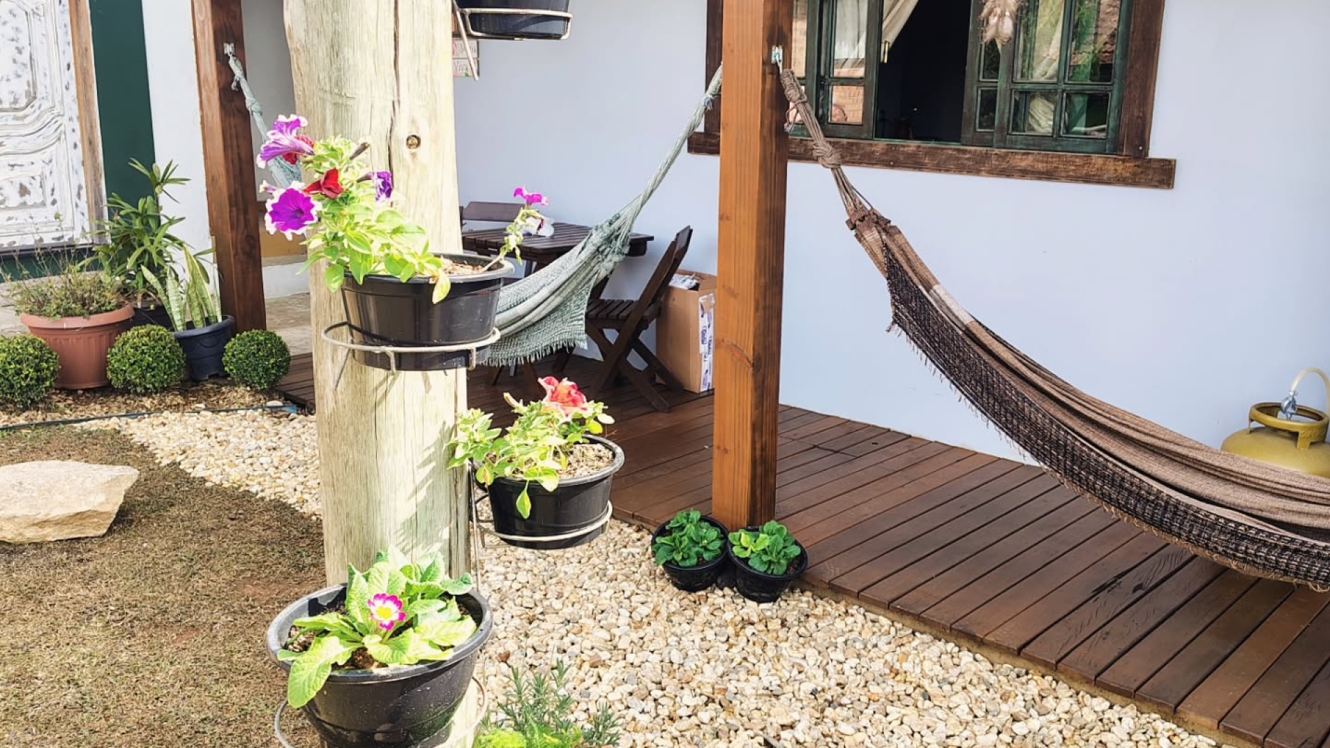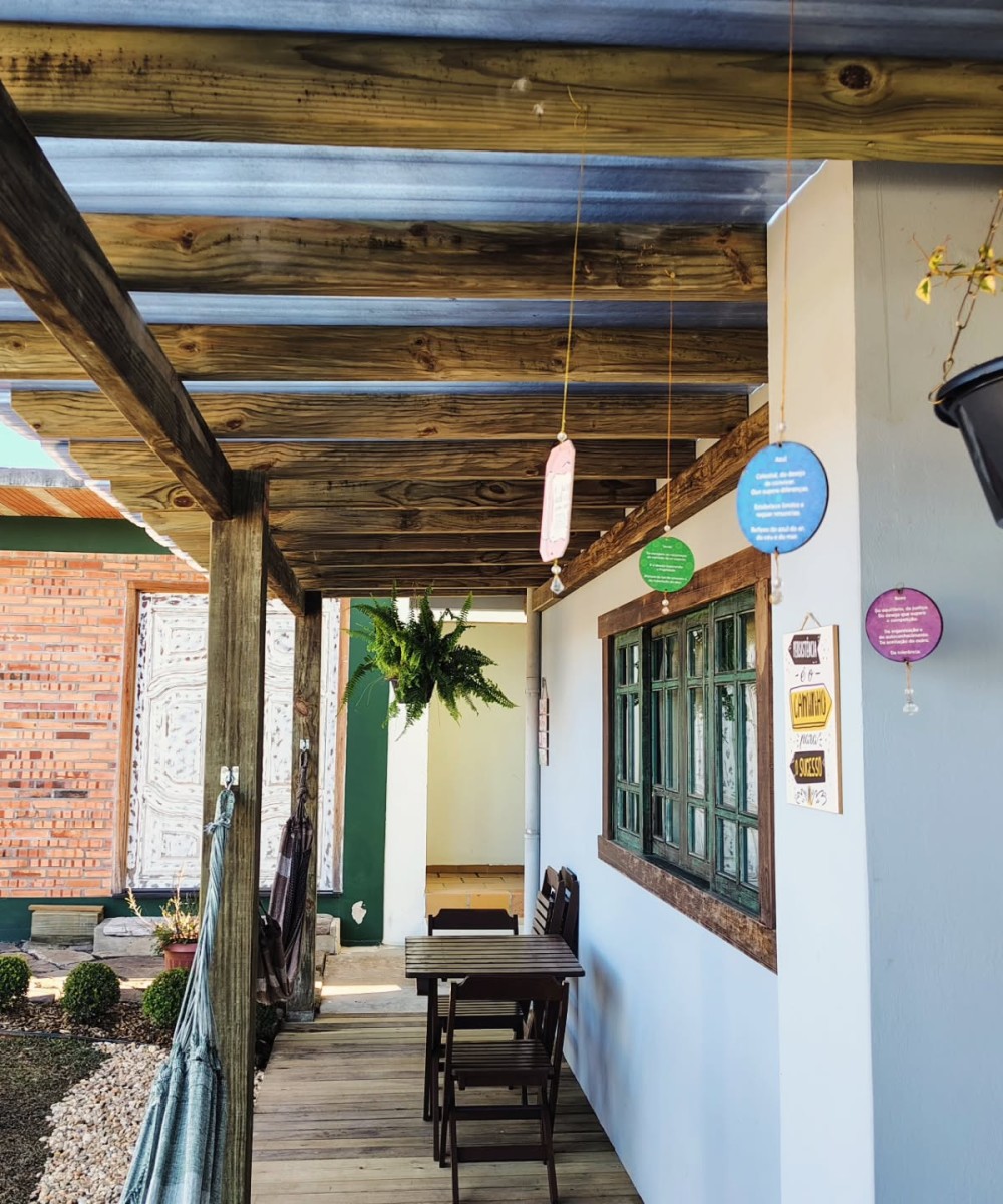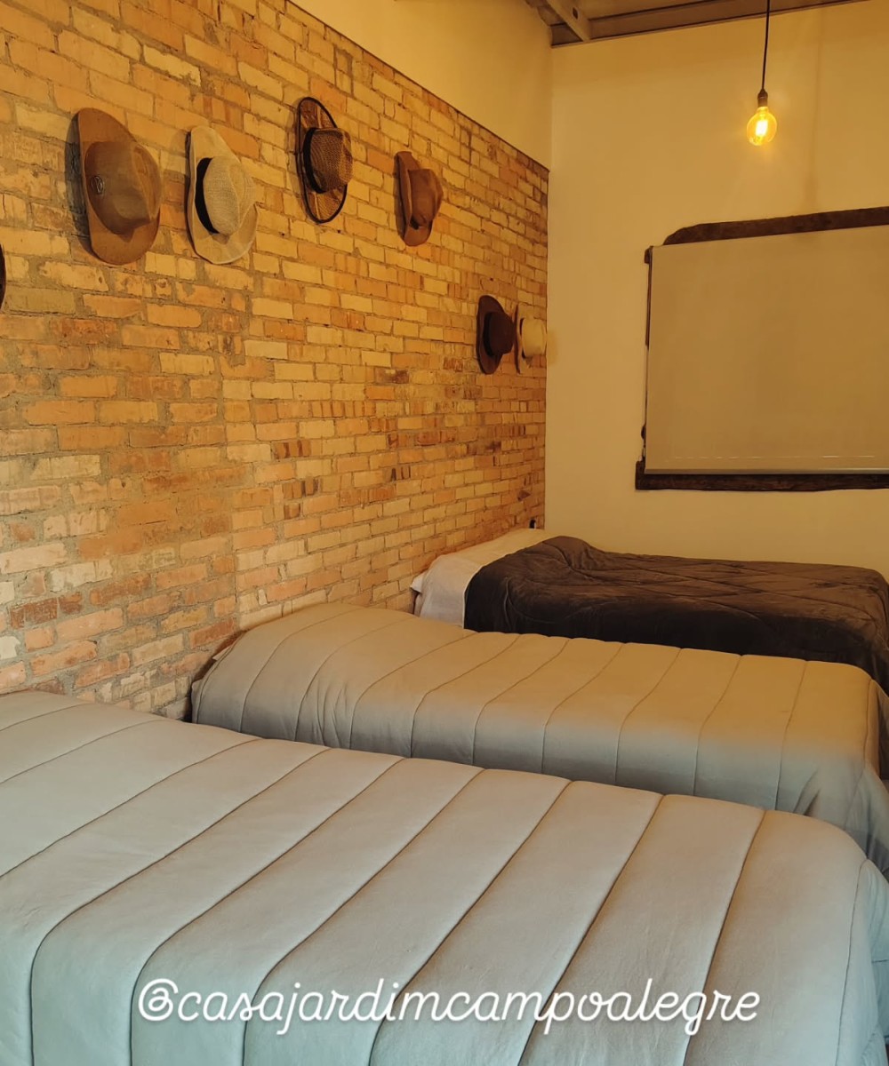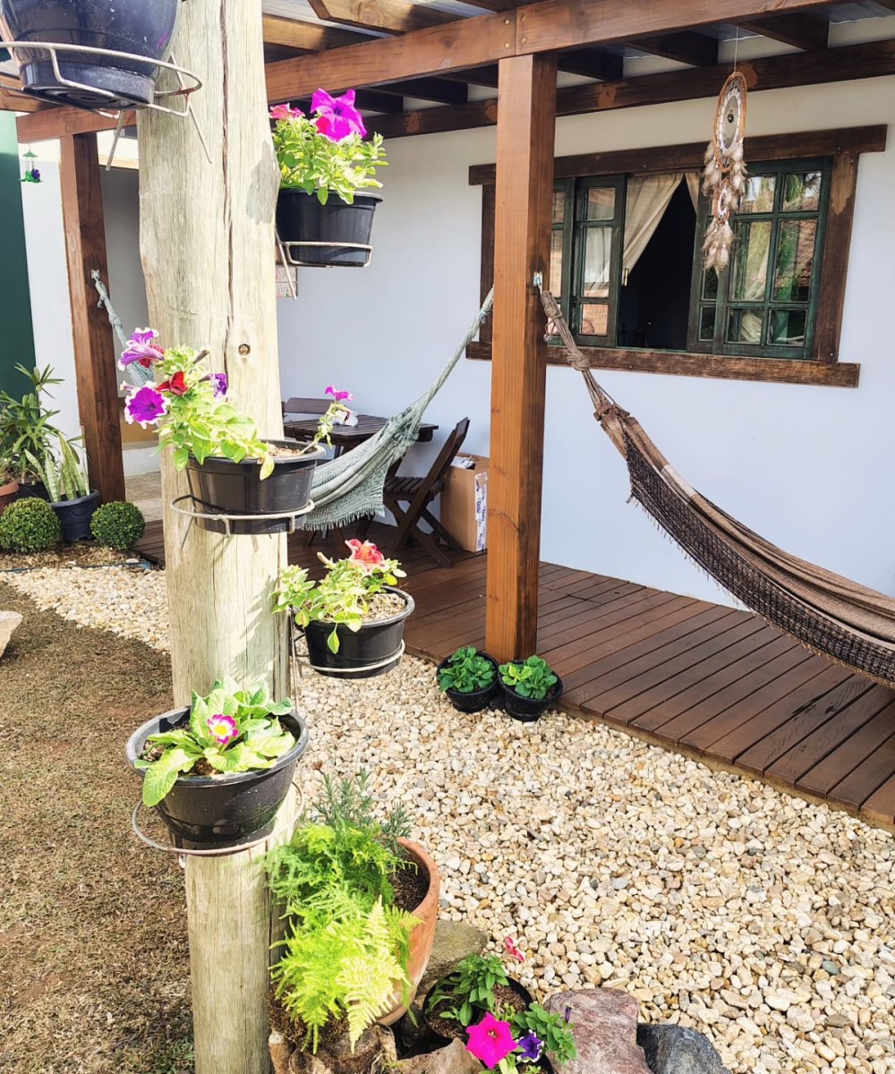 O amplo jardim, conta com um belo balanço e fogo de chão, além de poltronas com pelegos e redes de descanso no deck coberto. Localizada na entrada da cidade de Campo Alegre, a poucos passos da Pauli, mercados e restaurantes.