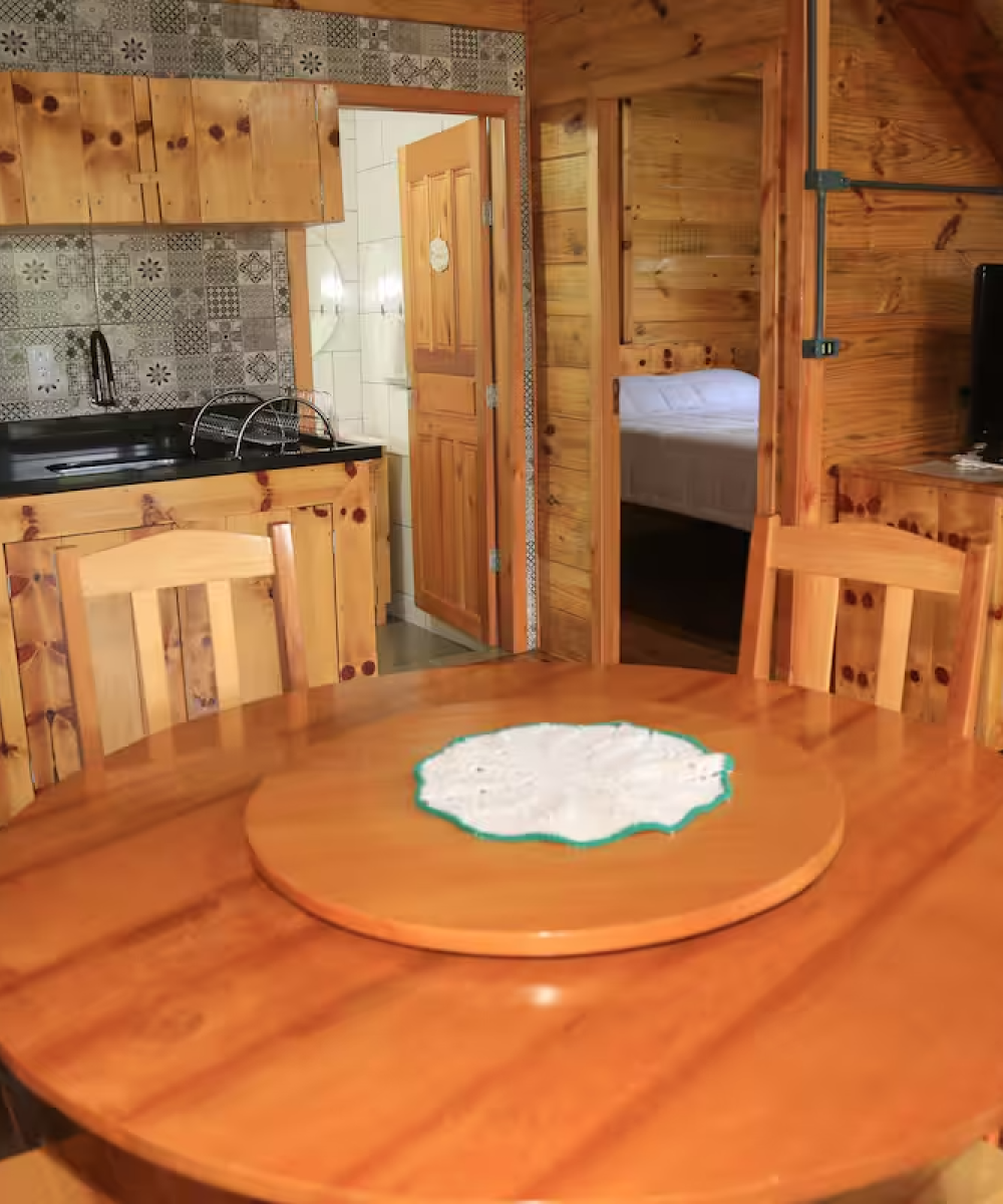 Chalé rústico mas muito confortável e privativo com vista para o lago.